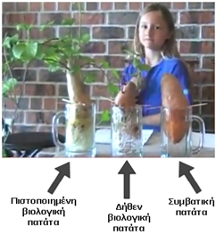 Μετά από δύο περιόδους τριών εβδομάδων (χρησιμοποιώντας δύο διαφορετικές πατάτες), η συμβατική απέτυχε εντελώς να βγάλει βλαστούς, ενώ η υποτιθέμενη βιολογική πατάτα ανέπτυξε μικρά φύλλα σε ένα μήνα. Δεν αποτελεί έκπληξη, ότι η βιολογική πατάτα από την αγορά των βιολογικών τροφίμων έβγαλε πολύ μεγάλα βλαστάρια και φύλλα σε μία μόνο εβδομάδα.