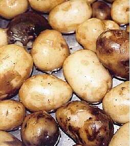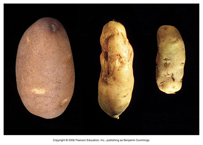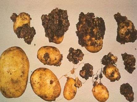 Στην φωτογραφία βλέπουμε στα αριστερά μια υγιή πατάτα και στα δεξιά μολυσμένες από το ιοειδές.
