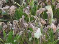 Στα τέλη Μαΐου-αρχές Ιουνίου, ανάλογα με την ανάπτυξη των φυτών και τις καιρικές συνθήκες, εμφανίζονται στα φύλλα μικρές γκρίζες-καφετιές κηλίδες, με κοκκινωπό-καστανό περιθώριο, που σιγά- σιγά πολλαπλασιάζονται και ξεραίνουν τελικά ολόκληρα τα φύλλα. Με υγρό καιρό στο κέντρο της κηλίδας εμφανίζονται μαύρα στίγματα και ένα γκρίζο-άσπρο χνούδι (καρποφορίες και σπόρια του παθογόνου), ιδιαίτερα στην κάτω επιφάνεια των φύλλων.