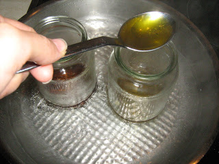 Σε ένα άλλο βαζάκι βάζουμε το τριμμένο μελισσοκέρι. Παίρνουμε ένα τηγάνι, το γεμίζουμε κατά το 1/3 με νερό, το βάζουμε σε μέτρια φωτιά και βάζουμε μέσα τα 2 σκεύη.