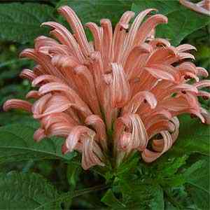 Η jacobinia carnea, το γνωστότερο είδος, έχει άνθη στο χρώμα του δέρματος ή ροζέ κόκκινα, των οποίων οι ταξιανθίες μοιάζουν με τούφες. Ανθίζει από τον Ιούνιο μέχρι τον Αύγουστο. Τα φύλλα της είναι καλυμμένα με χνούδι. Χρειάζεται ένα μέρος φωτεινό έως ημισκιερό, ζεστό το καλοκαίρι και πιο δροσερό το χειμώνα. Επειδή χρειάζεται πολλή υγρασία, είναι κατάλληλη για θερμοκήπιο. Ο πολλαπλασιασμός της γίνεται το Φεβρουάριο με μοσχεύματα κορυφής