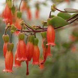 Κalanchoe manginii είναι κρεμοκλαδής με στενόμακρα ροζ, κόκκινα και πορτοκαλί άνθη σαν καμπανούλες.