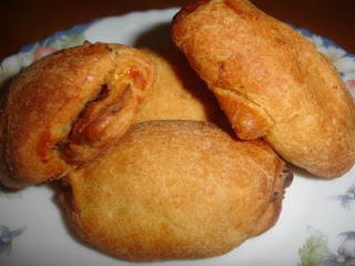Ενώνω τα υλικά και φτιάχνω τη ζύμη, την ανοίγω σε φύλλο, όχι ψιλό σαν της πίτας. Κατόπιν σε ένα τηγάνι με πολύ λίγο λάδι τσιγαρίζω το κρεμμύδι, τις ελιές, για λίγα λεπτά. Με αυτό γεμίζω το φύλλο σε διάφορα σημεία, κόβω και φτιάχνω πιτάκια σε ότι σχέδιο θέλω. Ψήνω σε πολύ χαμηλή θερμοκρασία, μέχρι να ροδίσουν