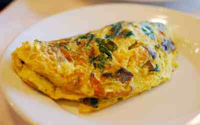-με τη βοήθεια ενός ρηχού πιάτου γυρίζουμε την ομελέτα να ψηθεί και από την άλλη μεριά