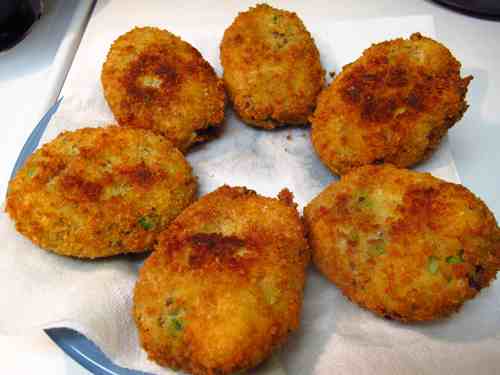 Καθαρίζουμε τις πατάτες και τις βράζουμε για να μαλακώσουν. Τις στραγγίζουμε και τις πολτοποιούμε στον μύλο του πουρέ. Τις τοποθετούμε σε μεγάλο μπολ μαζί με τα υπόλοιπα υλικά (εκτός από το αλεύρι) και ανακατεύουμε καλά. Βάζουμε το μίγμα για μισή ώρα στο ψυγείο να σφίξει. Πλάθουμε κεφτέδες, τους αλευρώνουμε και τους τηγανίζουμε σε καυτό λάδι, ώσπου να ροδίσουν και να γίνουν τραγανοί.