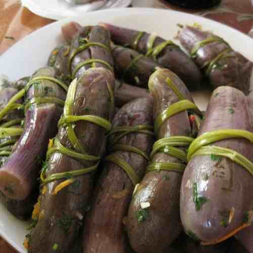 Κάνετε σχισμές στα μελιτζανάκια κατά μήκος (μια σχισμή για μελιτζανούλες τσακώνικες και 4 σχισμές σε σχήμα σταυρού για μελιτζανούλες φλάσκες). Δημιουργείτε έτσι τσεπούλες να μπει η γέμιση. Προσέξετε να μην σχίσετε τη μελιτζάνα από άκρη σε άκρη.