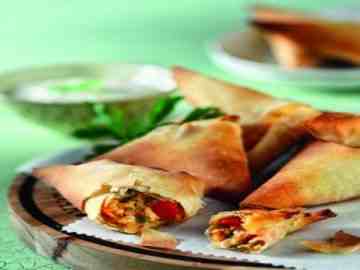 Ροδοψημένα τρίγωνα πιτάκια με γέμιση από λαχανικά και πικάντικο κιμά από κοτόπουλο... Πρώτης τάξης ορεκτικό για το κυριακάτικο ή το καθημερινό τραπέζι, για το πάρτι αλλά και ένα ωραίο σνακ για το γραφείο.