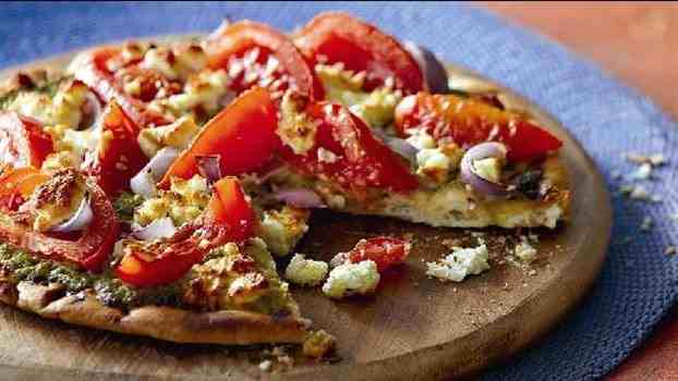 Βάζουμε την πίτα σε ένα ταψάκι, την αλείφουμε με το πέστο, απλώνουμε τις ντομάτες, τη φέτα και το κρεμμύδι, ραντίζουμε με το ελαιόλαδο και τέλος ρίχνουμε το πιπέρι. Την ψήνουμε στου 220 βαθμούς για 10 λεπτά, στην τελευταία σχάρα κάτω, στις αντιστάσεις. Σερβίρουμε με μια πράσινη σαλάτα.