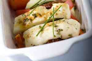 Για το σερβίρισμα: Βγάζουμε τα πακετάκια αλουμινόχαρτου από το φούρνο και, όσο είναι ακόμη ζεστά, τα μεταφέρουμε σε 4 πιάτα. Ανοίγουμε τα αλουμινόχαρτα, χωρίς να τα αφαιρέσουμε και μοιράζουμε τη σάλτσα λαχανικών σε κάθε κομμάτι τυριού. Δίπλα βάζουμε από μία φέτα ψωμιού (με σκόρδο ή με πάστα ελιάς) και σερβίρουμε αμέσως.