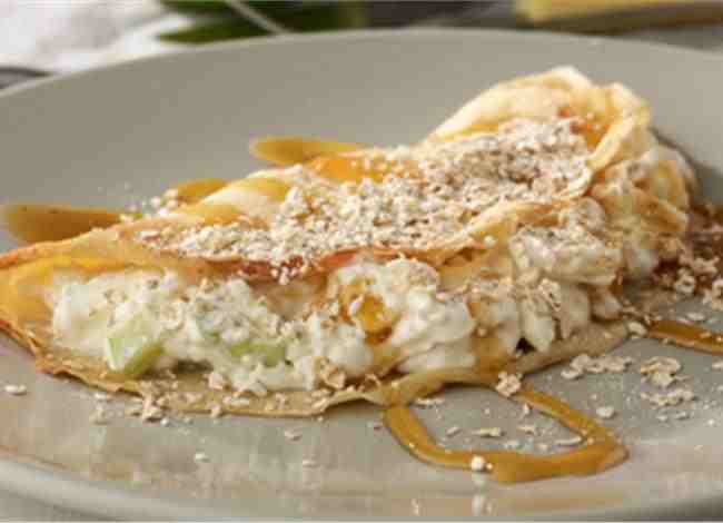 Φύλλο κρέπας γεμιστό με γιαούρτι light και φρέσκια φρουτοσαλάτα μαζί με νιφάδες Βρώμης και μέλι για απόλυτη απόλαυση!