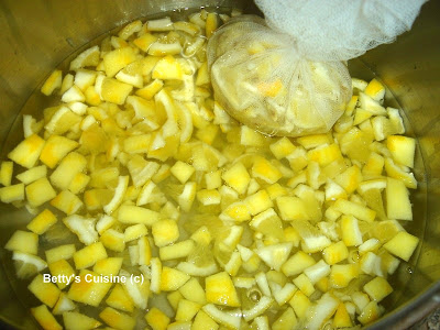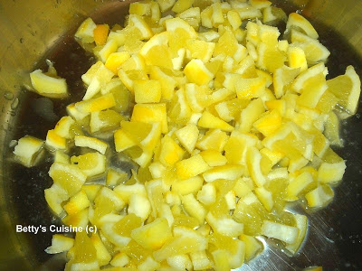 Αφαιρούμε τα κουκούτσια και τις εσωτερικές σκληρές μεμβράνες και ψιλοκόβουμε τα λεμονια σε μια κατσαρόλα.