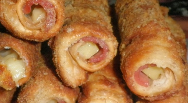 Ζεσταίνουμε το λάδι σε ένα βαθύ τηγάνι. Τοποθετούμε κάθε ρολό στο τηγάνι και τηγανίζουμε μέχρι να ροδίσουν από όλες τις μεριές. Αφαιρούμε από το τηγάνι και τα τοποθετούμε σε χαρτί κουζίνας. Τα σερβίρουζε ζεστά, ολόκληρα ή κομμένα στη μέση ή σε περισσότερα κομμάτια για μεζέ.