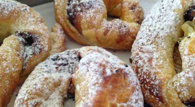 Διπλώνουμε το κάθε τρίγωνο ξεκινώντας να ρολάρουμε τη ζύμη από τη φαρδιά πλευρά του προς τη μύτη του τριγώνου. Ενώνουμε τις δύο άκρες σχηματίζοντας ένα κύκλο (Δουλεύουμε γρήγορα τη σφολιάτα γιατί όσο ζεσταίνεται αρχίζει να κολλάει και κάνει το ρολάρισμα δυσκολότερο.)
