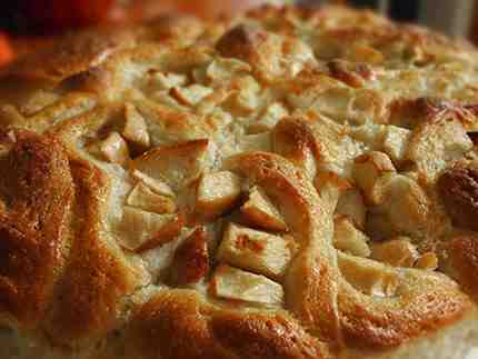 2. Σκεπάζετε την ζύμη και την αφήνετε να φουσκώσει μέχρι να διπλασιαστεί σε όγκο, για 2 ώρες περίπου. Εν τω μεταξύ, πλένετε τα μήλα, τα κόβετε σε κομμάτια και πετάτε τους σπόρους. Κόβετε σε κύβους 1 - 1,5 εκ. περίπου. Τα ανακατεύετε με τα υπόλοιπα υλικά της γέμισης. Βουτυρώνετε ένα ταψάκι, 22 εκ. περίπου διάμετρο.