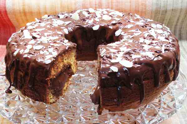 Για το κέικ : Σε ένα μπολ χτυπάμε με το μίξερ τα αυγά με την ζάχαρη πολύ καλά μέχρι να αφρατέψουν και προσθέτουμε όλα τα υπόλοιπα υλικά μας (εκτός από τα αμύγδαλα φιλέ). Χτυπάμε καλά και αδειάζουμε το μείγμα σε βουτυρωμένη φόρμα. Ψήνουμε σε προθερμασμένο φούρνο στους 170 βαθμούς για 40 – 45 λεπτά (ανάλογα με τον φούρνο μας), δοκιμάζοντας πάντα με ένα μαχαίρι (αν βγει καθαρή η λεπίδα μόνο με υδρατμούς είναι έτοιμο). Αφήνουμε να κρυώσει και ετοιμάζουμε την κρέμα σοκολάτα.