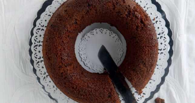 Αναμειγνύουμε σε μεγάλο μπολ όλα τα ξηρά συστατικά και ανακατεύουμε καλά. Προσθέτουμε σταδιακά και όλα τα υγρά συστατικά, ανακατεύοντας συνεχώς μέχρι να ομογενοποιηθούν καλά. Ετοιμάζουμε τη φόρμα του γλυκού αλείφοντας τη βάση και τις πλευρές της πρώτα με το βούτυρο, λίγο αλεύρι και με λίγη μαύρη ζάχαρη. Χύνουμε το μείγμα στη φόρμα και ψήνουμε το γλυκό σε προθερμασμένο φούρνο στους 180°C για 35 λεπτά. Το αφήνουμε να κρυώσει καλά για 2 περίπου ώρες πριν το σερβίρουμε. Για διακόσμηση, μπορούμε να χρησιμοποιήσουμε χοντροκομμένα καρύδια ή φέτες πορτοκαλιού.