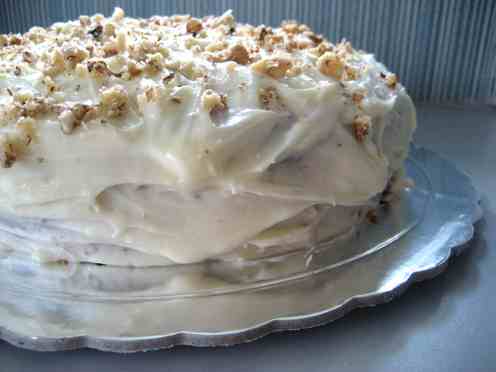 Για το γλάσο: με ένα μίξερ χειρός χτυπήστε το βούτυρο με την άχνη ζάχαρη και προσθέστε σταδιακά το τυρί κρέμα. Απλώστε στο κέικ όταν αυτό θα έχει κρυώσει τελείως και πασπαλίστε, εάν θέλετε, με ψιλοτριμμένο καρύδι. Σημείωση: φροντίστε το βούτυρο να είναι πραγματικά μαλακό (όχι λιωμένο) γιατί διαφορετικά θα κάνει σβώλους και το γλάσο δεν θα γίνει κρεμώδες.