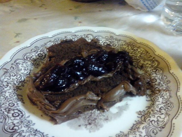 Μολις κρυώσει γλασάρουμε με την μερέντα. Κοβουμε το κομματι και το διακοσμουμε με λιγη μερεντα και μαρμελαδα βυσσινο