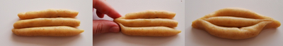 Το σχήμα για τα παραδοσιακά Σμυρνέικα κουλουράκια, το φτιάχνουμε βάζοντας παράλληλα 3 κορδονάκια και πιέζοντας τις άκρες τους να γίνουν σαν βαρκούλα.