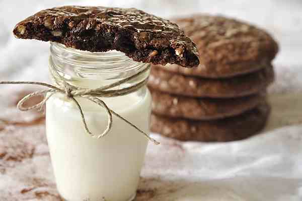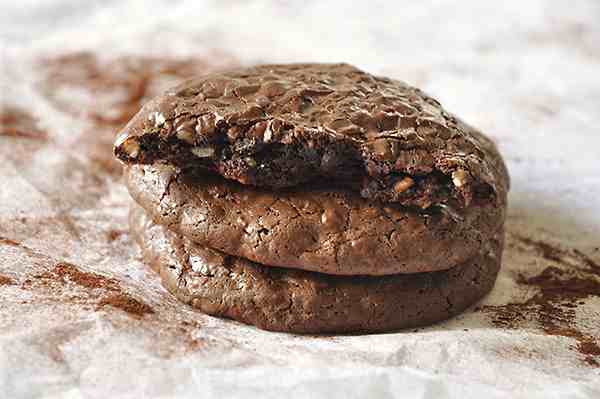 Το να φτιάξεις απίθανα σοκολατένια cookies χωρίς να χρησιμοποιήσεις βούτυρο ή αλεύρι, είναι αλήθεια ότι μου ακούστηκε πολύ καλό για να είναι αληθινό. Μια δαγκωματιά, όμως, από αυτά τα σκουρόχρωμα cookies με τη λεπτή, τραγανή κρούστα και το μαλακό, υγρό και μαστιχωτό εσωτερικό, ήταν αρκετή για να με πείσει. Με υφή και γεύση που σε παραπέμπουν έντονα σε brownies, γεμάτα από καβουρδισμένα, τραγανά καρύδια και με πλούσια σοκολατένια γεύση, είναι ένας συνδυασμός που τα καθιστά επικίνδυνα εθιστικά κι εντελώς ακατάλληλα για μη εγκρατείς γλυκατζήδες με ιδιαίτερη έφεση στη σοκολάτα.