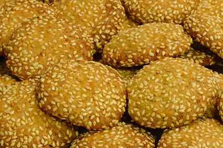 Τα ακουμπάτε στο πιάτο με το σουσάμι και τη ζάχαρη, από τη μία πλευρά μόνο και τα τοποθετείτε πάνω στην λαμαρίνα σε απόσταση μεταξύ τους, γιατί φουσκώνουν.