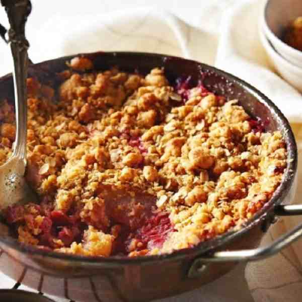 3. Στο μεταξύ κοσκινίστε τα δύο είδη άλευρα και το ginger σε ένα μπολ. Προσθέστε το βούτυρο και δουλέψτε το μείγμα με τα δάχτυλά σας μέχρι να μοιάζει με ψίχουλα. Προσθέστε τις νιφάδες βρώμης και την καστανή ζάχαρη και ανακατέψτε. Βγάλτε το σκεύος σας από το φούρνο, πετάξτε το αλουμινόχαρτο και πασπαλίστε τα φρούτα σας με το μείγμα των αλεύρων. Ψήστε για 20-25 λεπτά μέχρι να ροδίσει το γλυκό σας και σερβίρετε με κρέμα γάλακτος, παγωτό ή κρέμα ζαχαροπλαστικής.
