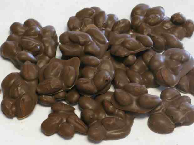 Βάζουμε τα αμύγδαλα σε ένα ταψάκι και τους ρίχνουμε το αλάτι, τα καβουρδίζουμε για λίγα λεπτά στο φούρνο (μέχρι να ροδίσουν ελαφρά). Λιώνουμε την κουβερτούρα σε μπεν μαρί και στη συνέχεια ρίχνουμε μέσα τα αμύγδαλα και ανακατεύουμε. Κόβουμε ένα κομμάτι λαδόκολλά, με ένα κουτάλι φτιάχνουμε ομοιόμορφα σοκολατάκια που τα τοποθετούμε πάνω της.