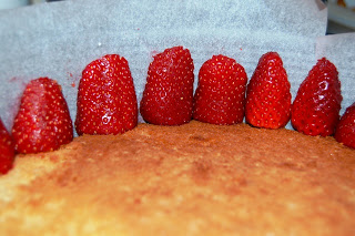 Σε μπολ χτυπάμε τα αυγά να αφρίσουν. Ρίχνουμε σιγά σιγά τη ζάχαρη και χτυπάμε για 5 λεπτά περίπου. Προσθέτουμε και τη βανίλια. Κοσκινίζουμε το αλεύρι με το baking powder και το αλάτι. Με μια σπάτουλα ενσωματώνουμε σιγά σιγά το αλεύρι στα αυγά. Σε ένα μπολάκι ανακατεύουμε το βούτυρο με δυο τρεις κουταλιές από το μείγμα και το προσθέτουμε στο μπολ. Ρίχνουμε το μείγμα σε μια βουτυρωμένη φόρμα που ανοίγει και ψήνουμε σε προθερμασμένο φούρνο στους 160β για 40 λεπτά περίπου.Αφήνουμε να κρυώσει για 20 λεπτά, βγάζουμε από τη φόρμα και αφήνουμε να κρυώσει εντελώς. Βάζουμε το παντεσπάνι σε πιατέλα και βάζουμε πάλι γύρω του το στεφάνι της φόρμας. Κόβουμε μια λωρίδα με αντικολλητικό χαρτί και τη βάζουμε εσωτερικά γύρω στο στεφάνι. Κόβουμε όμοιες σε μέγεθος φράουλες στα δυο και τις τοποθετούμε γύρω γύρω, επάνω στο χαρτί με το κομμένο μέρος προς τα έξω. Προσθέτουμε τις υπόλοιπες φράουλες κομμένες επάνω στο παντεσπάνι. Εγώ τις είχα βάλει σε μπολ με λίγη ζάχαρη και έριξα και το σιρόπι που έγινε, να μαλακώσει λίγο το παντεσπάνι.