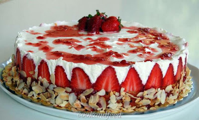 Βγάζουμε το στεφάνι της φόρμας με προσοχή και αλείφουμε με τη μαρμελάδα λίγο λίγο το παντεσπάνι. Κολλάμε τα αμύγδαλα επάνω στη μαρμελάδα. Διακοσμούμε με φράουλες ή όπως αλλιώς θέλουμε.