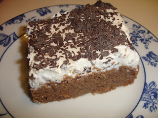 Χτυπάμε με τη σειρά που έχουμε γραμμένα τα υλικά, προσθέτοντάς τα ένα ένα στο μίξερ. Βουτυρώνουμε και αλευρώνουμε ένα βαθύ τετράγωνο ταψί κουζίνας, ρίχνουμε μέσα το μείγμα και το ψήνουμε στους 180 βαθμούς για 50 λεπτά της ώρας. Κατόπιν το αφήνουμε να κρυώσει καλά, το τρυπάμε με μία οδοντογλυφίδα σε πολλά σημεία και το περιχύνουμε με το κρύο σιρόπι που φτιάχνουμε βράζοντας 2 1/2 κούπες ζάχαρη, 2 1/2 κούπες νερό και 2 κουταλιές της σούπας χυμό λεμονιού. Μόλις κρυώσει το γλυκό χτυπάμε στο μίξερ μία πράσινη φυτική σαντιγύ με την οποία σκεπάζουμε το γλυκό και γαρνίρουμε με τριμμένη σοκολάτα.