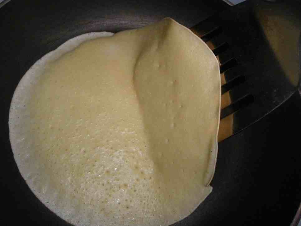 2. Βάζουμε στη φωτιά ένα μικρό τηγάνι τεφάλ διαμέτρου 22 εκ. να κάψει. Ρίχμουμε μισό περίπου φλυτζανάκι του καφέ (60 ml) χυλό γέρνοντας το τηγάνι ώστε ο χυλός να καλύψει τον πάτο (πρέπει να ανακατεύουμε το μείγμα κάθε φορά που παίρνουμε μία ποσότητα από αυτό). Όταν η κρέπα ψηθεί τη γυρίζουμε με μια σπάτουλα. Επαναλαμβάνουμε μέχρι να τελειώσει ο χυλός.