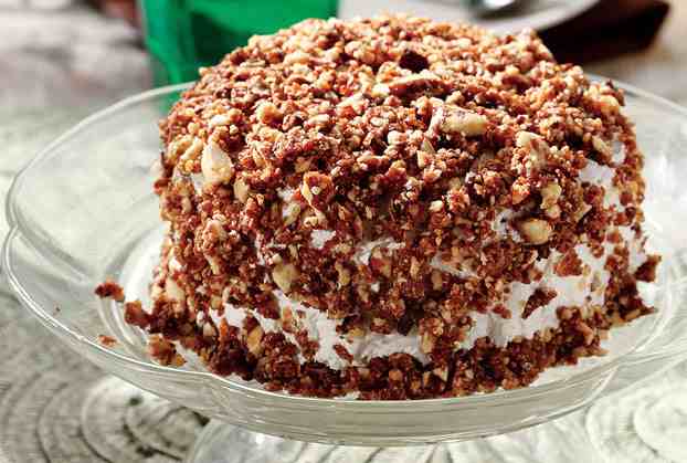 Προσθέτουμε το μασκαρπόνε και ¾φλ. τσαγιού από το μείγμα καφέ-ρούμι. Κόβουμε κάθε παντεσπάνι σε δύο φέτες. Τοποθετούμε το πρώτο παντεσπάνι σε πιατέλα. Με πινελάκι αλείφουμε με ¼μείγμα καφέ-ρούμι. Απλώνουμε 1 φλ. κρέμα μασκαρπόνε και στρώνουμε με σπάτουλα. Επαναλαμβάνουμε μέχρι να στήσουμε την τούρτα με τα τέσσερα παντεσπάνια. Αλείφουμε όλη την τούρτα εξωτερικά με την υπόλοιπη κρέμα μασκαρπόνε. Καλύπτουμε και τα τοιχώματα. Σε τηγάνι με χοντρή βάση ρίχνουμε τη ζάχαρη σε μέτρια φωτιά μέχρι να γίνει καραμέλα. Αποσύρουμε από τη φωτιά και με γρήγορες κινήσεις προσθέτουμε τα αμύγδαλα και ανακατεύουμε. Αδειάζουμε σε λαδόκολλα και απλώνουμε με κουτάλι να κρυώσει καλά το μείγμα. Το θρυμματίζουμε στο μίξερ ή σε γουδί. Πασπαλίζουμε την τούρτα και στα πλάγια με καραμελωμένα αμύγδαλα.