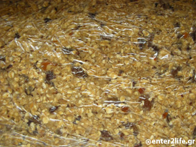 απλώνουμε διαφανή μεμβράνη και απλώνουμε το μείγμα να καλύψει όλη την επιφάνεια. Καλύπτουμε το μείγμα με διαφανή μεμβράνη και το βάζουμε στο ψυγείο για 30-40 λεπτά περίπου μέχρι να σφίξει. Όταν σφίξει αφαιρούμε τη μεμβράνη και κόβουμε σε ορθογώνια κομμάτια. Για την επικάλυψη σε ένα μπολ ανακατεύουμε ινδική καρύδα, ψιλοκομμένους ανάλατους ξηρούς καρπούς και κανέλα. Πασπαλίζουμε τις μπάρες και τις τυλίγουμε σε διαφανή μεμβράνη.