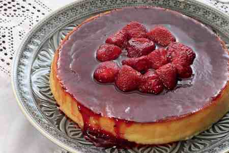 Βγάζουμε το γλυκό από το φούρνο και, όπως είναι ζεστό, απλώνουμε από πάνω το γλυκό κουταλιού φράουλα. Το αφήνουμε να κρυώσει εντελώς προτού σερβίρουμε.