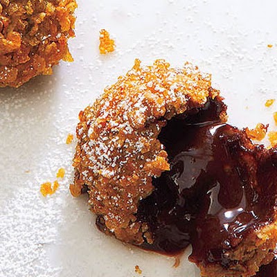 Βγάζουμε τη σοκολάτα από την κατάψυξη και την πλάθουμε σε μπαλάκια. Περνάμε τα μπαλάκια αρχικά από το αλεύρι, τινάζοντας για να φύγει η περίσσεια ποσότητα.