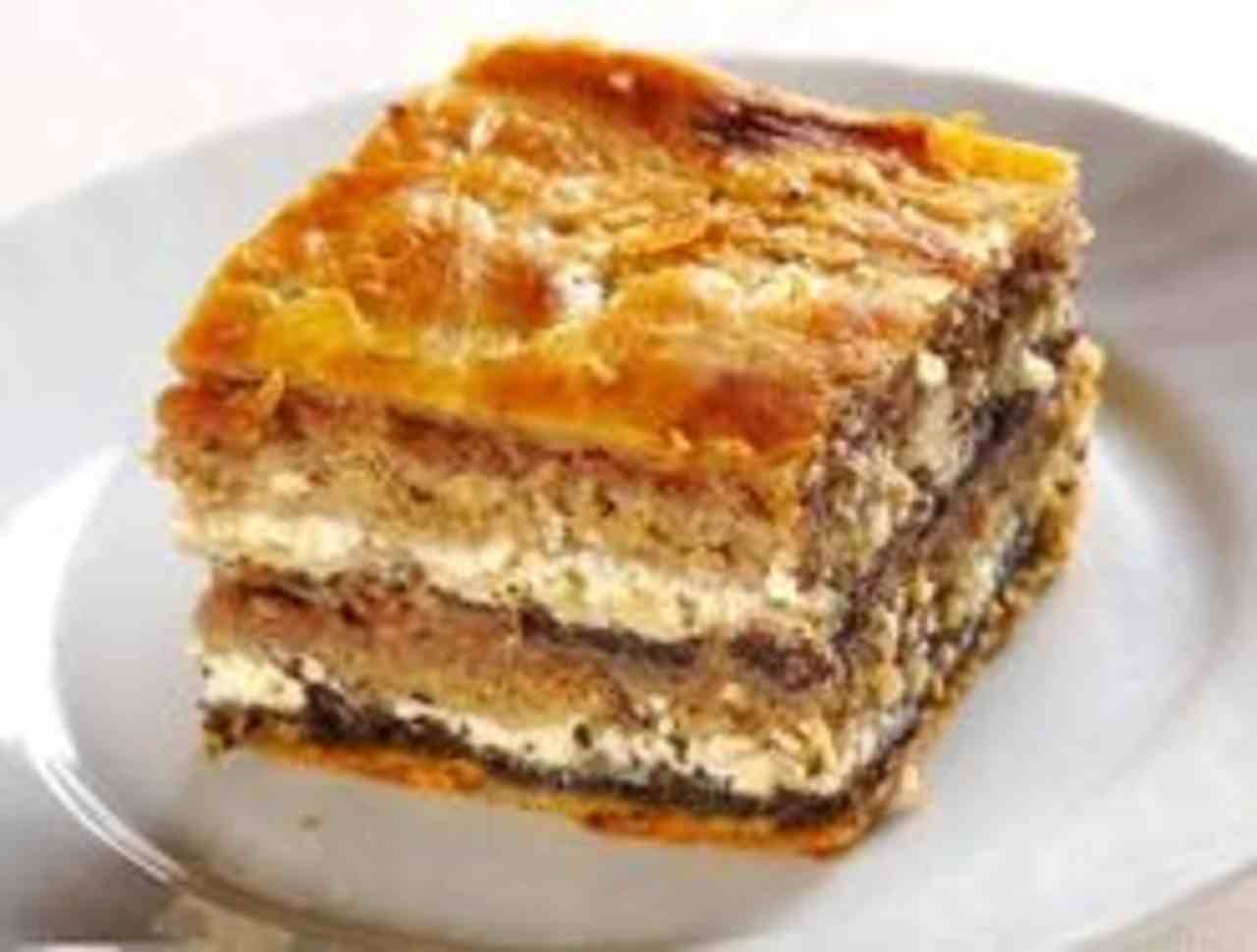 Επαναλαμβάνουμε αυτή τη διαδικασία με την υπόλοιπη γέμιση σπόρους παπαρούνας, μήλου, τυριού, και καρυδιού, φροντίζοντας πάντα να βουτυρώνουμε τα φύλλα.