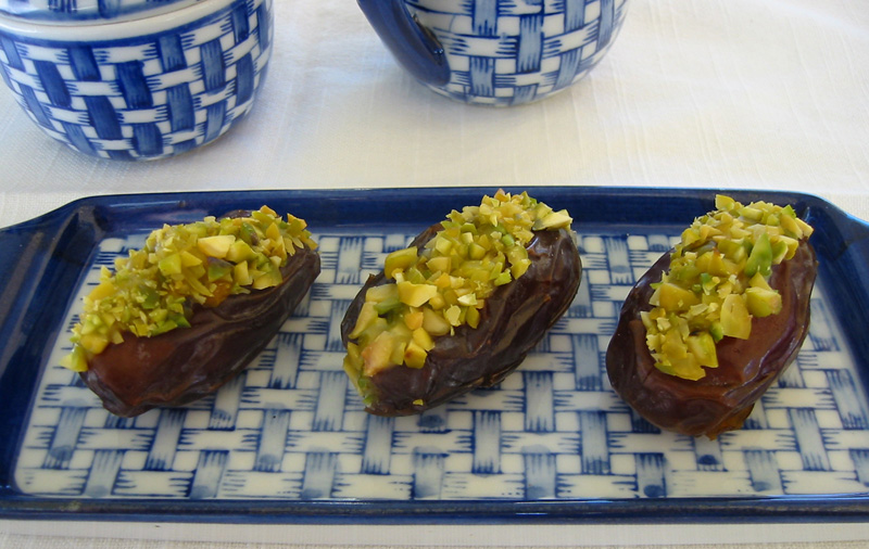 Την ώρα του καφέ, αντί για μεγάλο γλυκό, μπορούμε να δοκιμάσουμε γεμιστούς χουρμάδες πασπαλισμένους με πράσινα φυστίκια Αιγίνης. Τους γεμίζουμε με μασκαρπόνε, μια πυκνή βελούδινη κρέμα με ήπια γεύση που αναδεικνύει τα αρώματα που της προσθέτεις. Διαλέξαμε να την αρωματίσουμε με σπασμένα σποράκια κάρδαμου και λεπτοτριμμένη φλούδα φρέσκου λεμονιού. Είναι ειλικρινά, απόλαυση η κάθε μπουκιά!