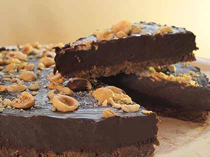 3. Βγάζετε τη βάση από το ψυγείο και αδειάζετε μέσα την γέμιση. Πασπαλίζετε με τα φουντούκια. Αφήνετε λίγο να κρυώσει και την ξαναβάζετε στο ψυγείο μέχρι να σφίξει (τουλάχιστον 2 ώρες).