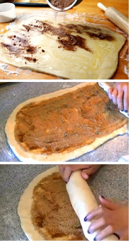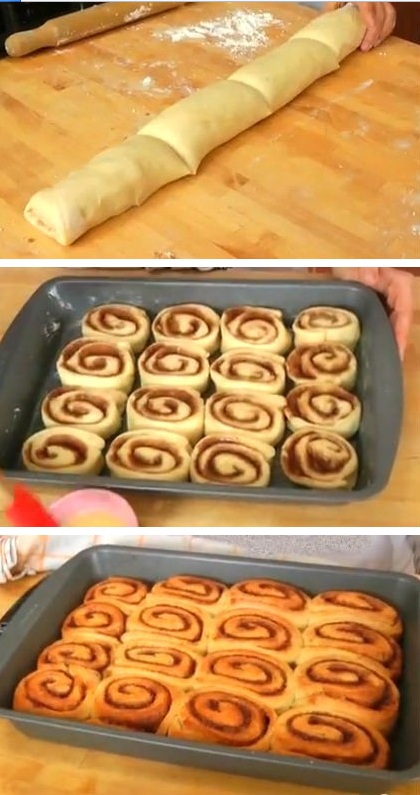Όταν διπλασιαστεί σε μέγεθος, απλώνετε την ζύμη σε αλευρωμένη επιφάνεια. Ανοίξτε τη ζύμη σε χοντρό φύλλο 1. 5 εκ. Απλώνετε το βούτυρο σε όλη την επιφάνεια του φύλλου και πασπαλίζουμε ομοιόμορφα το μείγμα της ζάχαρης και κανέλας. Πιάνετε την ζύμη από τις άκρες και ρολάρετε προσεκτικά. Κόψτε προσεκτικά σε 14 με 16 φέτες το ρολό και μεταφέρετε σε λαδωμένο ταψί. Καλύψτε με πλαστική μεμβράνη και αφήστε να τους φέρουν πίσω σε ζεστό μέρος να φουσκώσει για ακόμη 1 ½ ώρα.