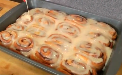 Αφήστε τα λίγο να κρυώσουν πριν ρίξετε το γλάσο. Ανακατεύουμε όλα τα υλικά για το γλάσο σε ένα μπολ εκτός από το γάλα, προσθέστε σιγά-σιγά το γάλα μέχρι να πάρει μια παχύρευστη μορφή το γλάσο μας. Αμέσως χύστε το γλάσο πάνω από τα ρολά.