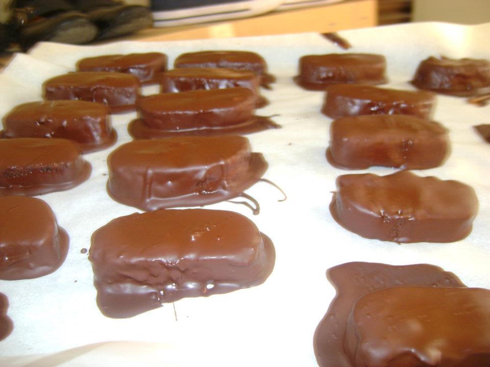 Το κέικ πρέπει να είναι μπαγιάτικο και στεγνό σε τρίμματα. Βάζουμε σε μπεν μαρί την κουβερτούρα και το υποβρύχιο και τα αφήνουμε σε χαμηλή φωτιά να λιώσουν. Αποσύρουμε από τη φωτιά. Προσθέτουμε το σιρόπι, το κονιάκ, το τριμμένο κέικ , την καρυδόψυχα , τα φρουί γλασέ , την κανέλλα και ανακατεύουμε καλά. Το μείγμα πρέπει να μοιάζει σαν πλαστελίνη. Απλώνουμε μεμβράνη στον πάγκο και κατά μήκος βάζουμε το μείγμα. Το τυλίγουμε σε ρολό όπως το μωσαϊκό. Ισιώνουμε τα πλαϊνά του τρίβοντας τις άκρες. Παγώνουμε μια νύχτα. Με κοφτερό μαχαίρι κόβουμε σε φέτες και τις βουτάμε σε λιωμένη κουβερτούρα. Τις αραδιάζουμε σε λαδόκολλα να παγώσει η κουβερτούρα. Τις τυλίγουμε σε αλουμινόχαρτο και τις φυλάμε στο ψυγείο. Αν αρχίσει να βγαίνει χοντρή η στρώση σοκολάτας ζεσταίνουμε λίγο να γίνει πιο χλιαρή και να μην κρατάει πολύ επικάλυψη.