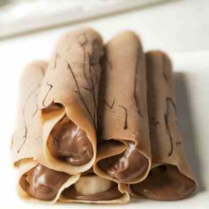 -Αφήνουμε τα κανελόνια να κρυώσουν και έπειτα τα γεμίζουμε με την πραλίνα και τις κομμένες μπανάνες.
