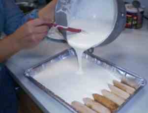 -Τα τοποθετούμε σ’ ένα επίπεδο ταψί ή πυρέξ, το ένα δίπλα στο άλλο μέχρι να γεμίσουμε την επιφάνεια.