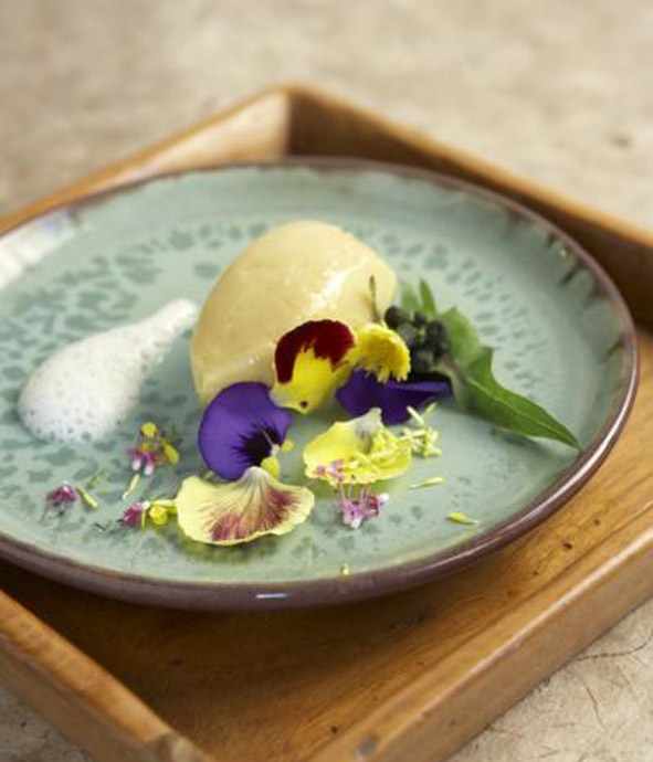 Η φάβα αρωματίζεται με τα λουλούδια και τις κορυφές διαφόρων χόρτων, που δίνουν μια ανθισμένη όψη και την πολύ ιδιαίτερη γεύση τους στο πιάτο.