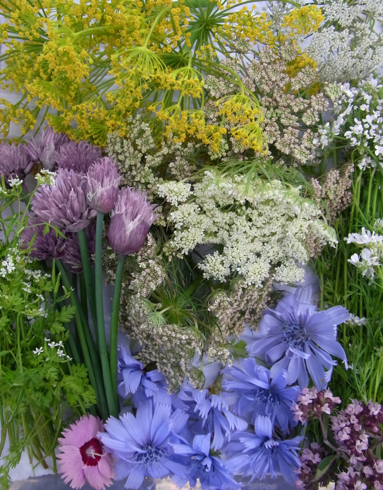 Οι τουλίπες αφού τους αφαιρέσετε τους στήμονες συμπληρώνουν μια σαλάτα κοτόπουλο! Επίσης και τα λουλούδια της γιούκας, αφού πρώτα τους αφαιρεθούν οι καρδιές γιατί είναι πικρές. Η γουϊστέρια για κρασί, κομπόστες, τηγανίτες και μέλι. Η Βερμπένα για φρουτοχυμούς και κρασιά. Ξύδι από άνθη ροδακινιάς μπορείτε να φτιάξετε ρίχνοντας 25-30 γραμμάρια λουλούδια σε ένα δοχείο με μισό λίτρο ζεστό και να το αφήσετε για 15 μέρες. Χρησιμοποιήστε το στο επόμενό σας γεύμα. Άνθη φλαμουριάς μπορούν να γίνουν τσάι ή να προσθέσουν άρωμα στο μέλι. Ηλίανθοι, μας δίνουν τους σπόρους τους. Σκυλάκια σε σάλτσα μήλου με σταφίδες. Άνθη κίτρινου κρόκου ανακατεμένα με βούτυρο σερβίρονται σε τοστ. Παπαρούνες, δαμάσκηνα, ηράνθεμα, και πανσέδες. Και ορχιδέες αν τολμάτε! Γλαδιόλες ανακατεμένες σε σαλάτες ή ομελέτες. Μυρωδάτα γεράνια ταιριάζουν σχεδόν σε όλα!