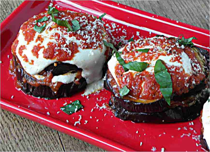 4. Διαλέγουμε τις 8 μεγαλύτερες ροδέλες, απλώνουμε σε κάθε μια από 1 κ.σ. σάλτσα και 1 φέτα μοτσαρέλλα και σκεπάζουμε με ακόμη μια ροδέλα μελιτζάνας. Επαναλαμβάνουμε μέχρι να τελειώσουν τα υλικά μας.