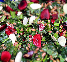 Εκτέλεση: Αραδιάζουμε το προσούτο σε λαμαρίνα στρωμένη με λαδόκολλα και το ψήνουμε για 15΄ στους 200οC, να γίνει τραγανό. Το αφήνουμε να κρυώσει. Πλένουμε και στραγγίζουμε καλά όλα τα λαχανικά. Τα στήνουμε σε ανοιχτή πιατέλα. Ψιλοκόβουμε τις λιαστές ντομάτες και τις προσθέτουμε. Στρώνουμε το πεπόνι γύρω γύρω. Ψιλοκόβουμε το τραγανό προσούτο πάνω από τη σαλάτα. Προσθέτουμε τα αμύγδαλα και τις φλούδες γραβιέρας. Τοποθετούμε τα υλικά για τη σoς στο μπλέντερ και τα πολτοποιούμε. (Θα γίνει σαν κρέμα). Περιχύνουμε τη σαλάτα.