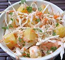 Υλικά Για 4-6 άτομα 1⁄2 φλιτζάνι τσαγιού γιαούρτι σακούλας πάπρικα καρύδια κομμένα στη μέση 6 φλιτζάνια τσαγιού ψιλοκομμένο λάχανο 1 μεγάλο πράσινο μήλο 2 κουταλιές ξίδι αλάτι 4 φέτες ανανά κομμένες σε κομμάτια 1⁄2 φλιτζάνι τσαγιού σπασμένα καρύδια 1⁄2 φλιτζάνι τσαγιού μαγιονέζα