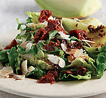 Υλικά: 2 φλ. τσαγιού μικρά τρυφερά φύλλα σπανάκι 1 πράσινη σαλάτα 1 ματσάκι ρόκα 4 λιαστές ντομάτες 4 φέτες πεπόνι (κομμένο σε τρίγωνα) 4 φέτες προσούτο Καρπενησίου 1/2 φλ. τσαγιού φλούδες πικάντικη γραβιέρα 1/2 φλ. τσαγιού φιλέ αμυγδάλου Για τη σος 1/3 φλ. τσαγιού ελαιόλαδο 3 κ.σ. μπαλσάμικο 2 λιαστές ντομάτες 1/2 κ.γλ. μέλι 1 πρέζα αλάτι