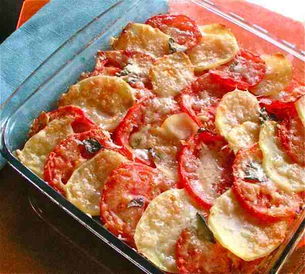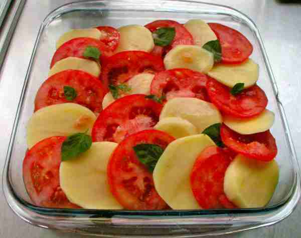 Τοποθετείστε πρώτα μια στρώση από κρεμμύδια, από πάνω τακτοποιείστε τις ροδέλες απ΄τις πατάτες και μετά αυτές με τις ντομάτες. Ρίξτε λίγο λάδι, αλάτι πιπέρι και πασπαλίστε με το τριμμένο τυρί. Επαναλάβατε την διαδικασία μέχρι να τελειώσουν όλα τα λαχανικά, τελειώνοντας με μια στρώση από ανάμικτες πατάτες – ντομάτες, που εναλάσσονται. Βάλτε ανάμεσά τους σε διάφορα σημεία τα φύλλα βασιλικού (αν είναι τα μεγάλα, κόψτε τα με το χέρι σε μικρότερα). Πασπαλίστε με τυρί, αλατοπιπερώστε και ρίξτε λίγο ακόμη λάδι.